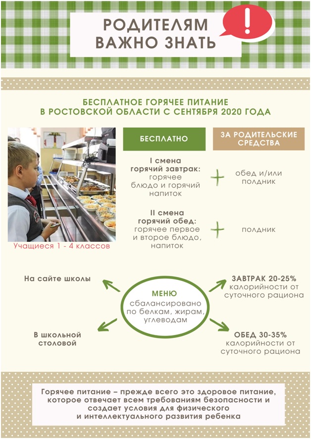 В соответствии с задачей, поставленной Президентом Российской Федерации Владимиром Путиным в Послании Федеральному Собранию, все учащиеся младших классов школы обеспечены бесплатным горячим питанием один раз в день.