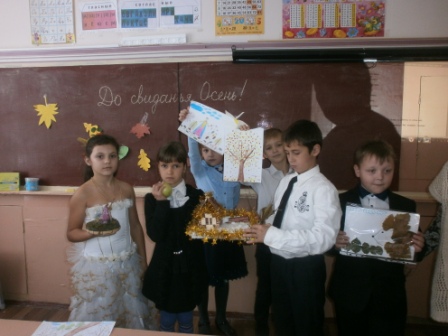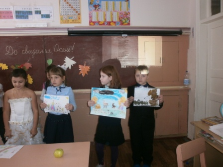 В 4б классе прошёл праздник « Прощай, Осень!» Дети нарисовали Осень, сделали поделки. Красавица-Осень угостила детей яблочками.