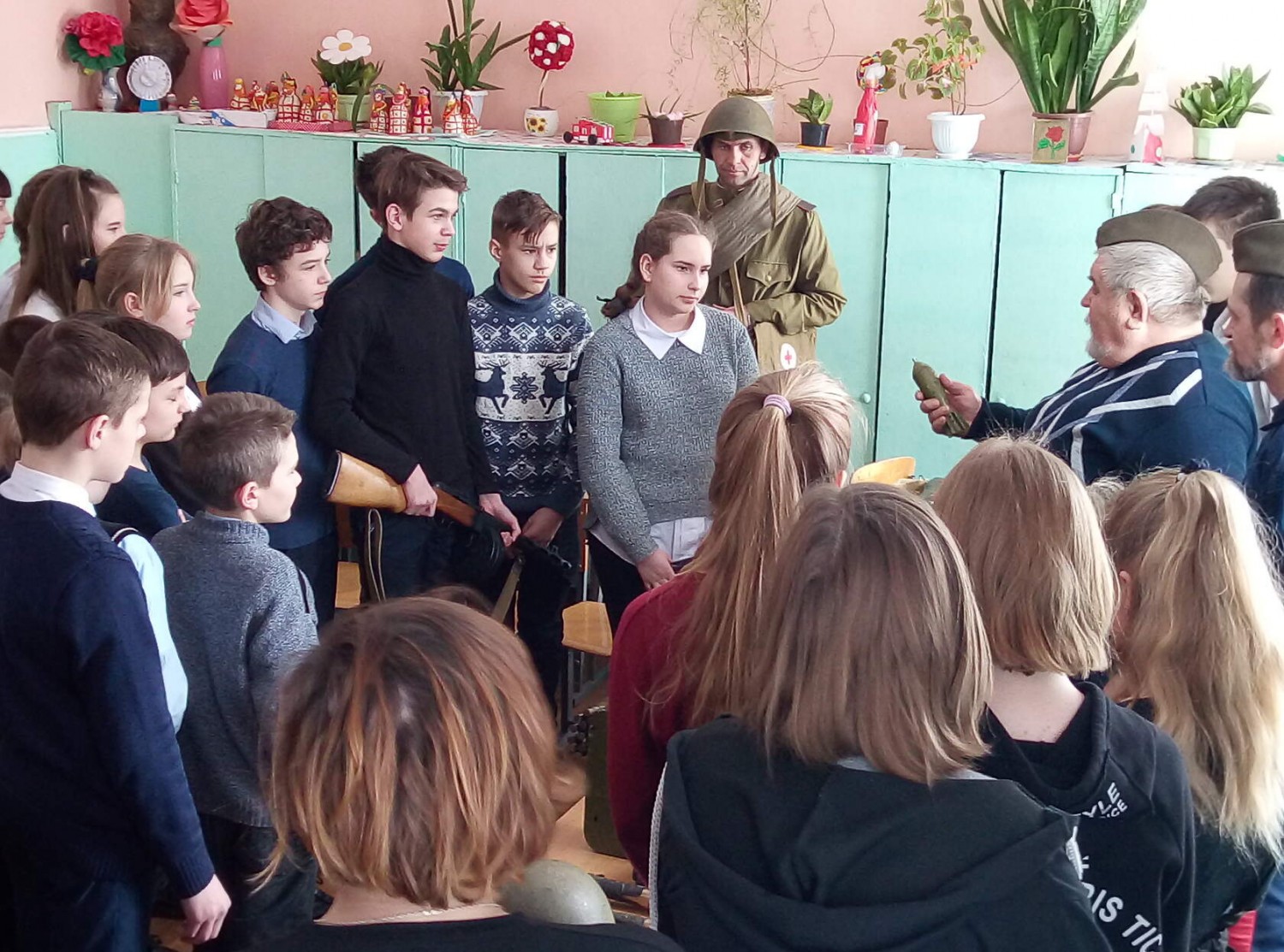 Казаки привезли с собой выездной музей Великой Отечественной войны. Обучающиеся познакомились с оружием времен Великой Отечественной войны, боевыми припасами, которые ребята смогли подержать в руках, «зарядить» и нажать на спусковой крючок.