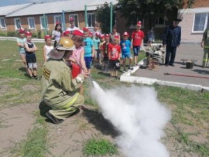 Председатель ВДПО Белашев Н.Д. рассказал ребятам о типах огнетушителей, о правилах их применения. Практическая часть дала возможность каждому ребенку почувствовать себя огнеборцем. Порошковым огнетушителем они тушили условный пожар.