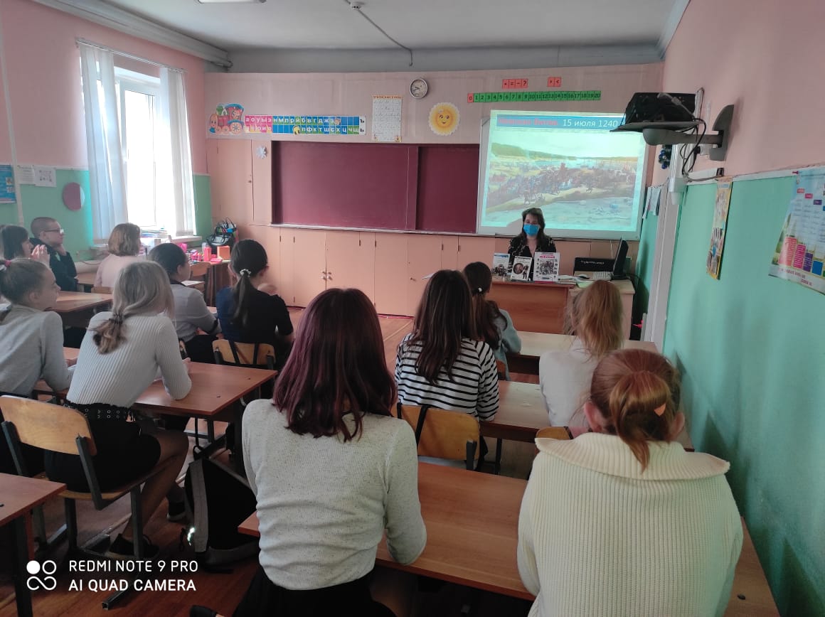 Во время урока ребята подробнее познакомились с личностью Александра Невского, узнали, каким было его детство, как отец готовил его к княжению и будущим военным подвигам, его победах в Невской битве 1240 года и ледовом побоище 1242 года, а также о его деятельности как князя, который очень много сделал для возрождения Руси после ордынского нашествия.