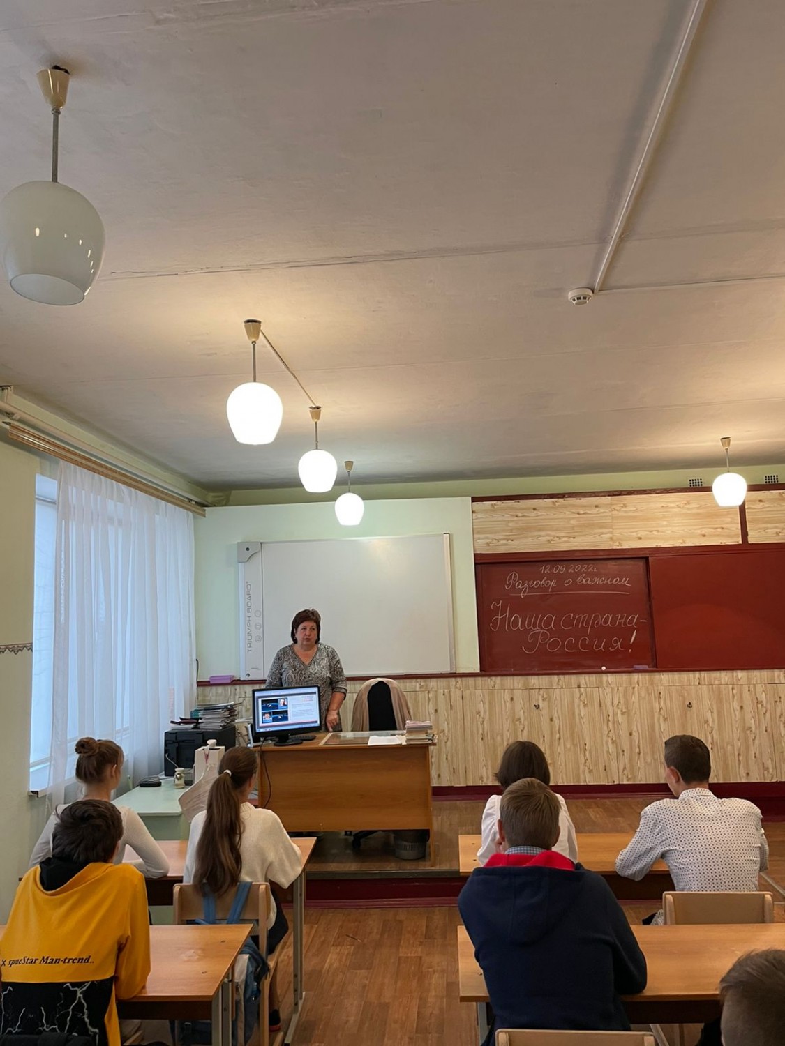 12 сентября в 9 классе МБОУ СОШ № 5 г.Донецка прошло второе занятие цикла «Разговоры о важном» по общей теме «Наша страна — Россия». Обучающиеся посмотрели видеофильм о древнейшей истории нашей страны, ее богатой культуре и традициях. Затем ребята разделились на 2 команды и приняли участие в интеллектуальной игре «В чем русские были первыми?», вспомнили о достижениях Петра I , изобретениях И.Кулибина и открытиях С.Дежнёва. Классный руководитель Алиева И.Н. напомнила обучающимся о культурном и историческом единстве русского народа, а также о важности его сохранения с целью формирования гражданской идентичности и гордости за свою страну.