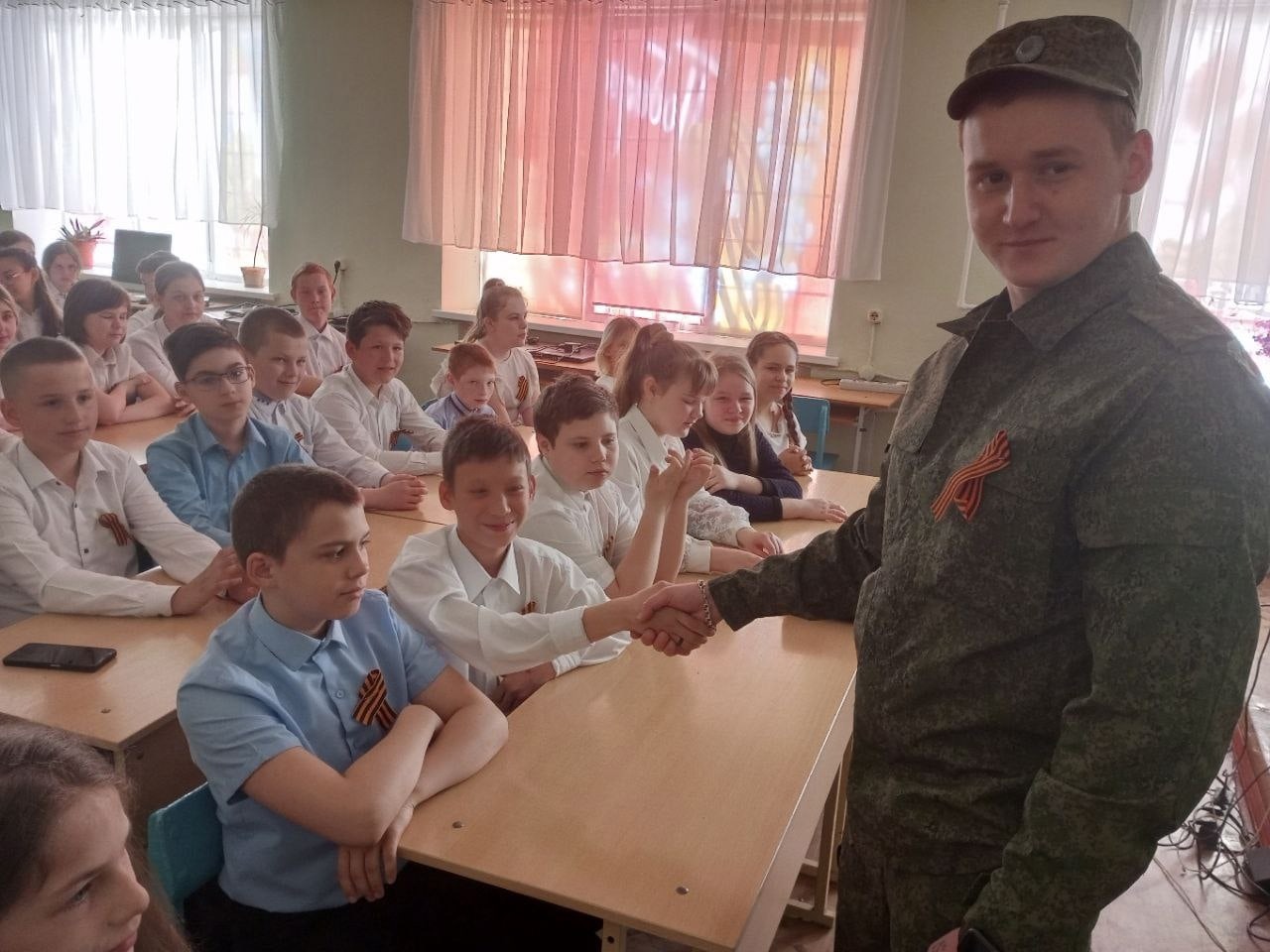 19 мая учеников 5б и 6 класса посетил выпускник школы и участник СВО Сауляк Дмитрий.