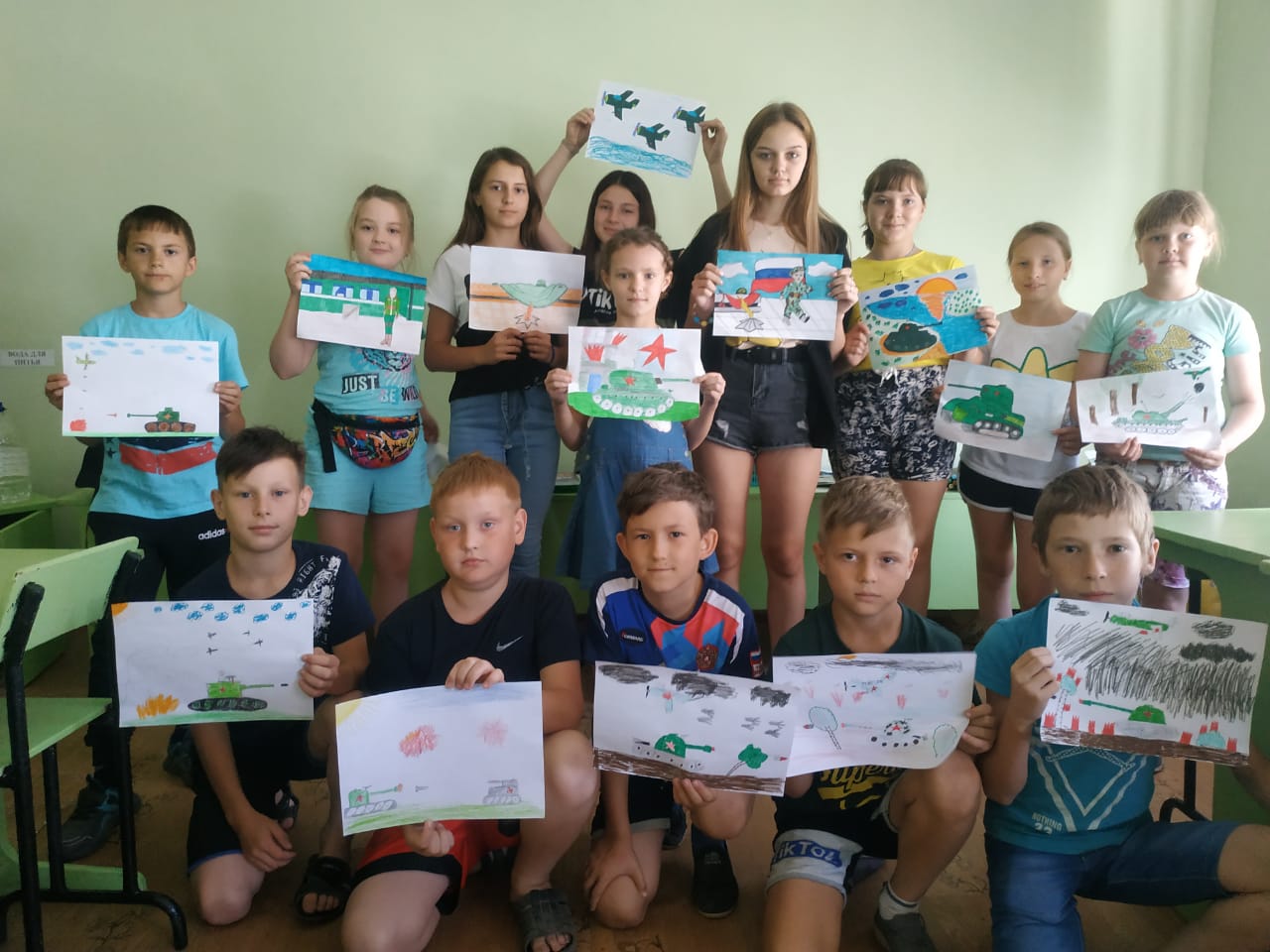 После зарядки и завтрака, у нас прошёл конкурс рисунков «Победе - 75», дети рисовали рисунки на военную тематику, каждый постарался, и получились очень хорошие работы. Результаты конкурса, а также имена победителей будут объявлены в понедельник 13 июля.