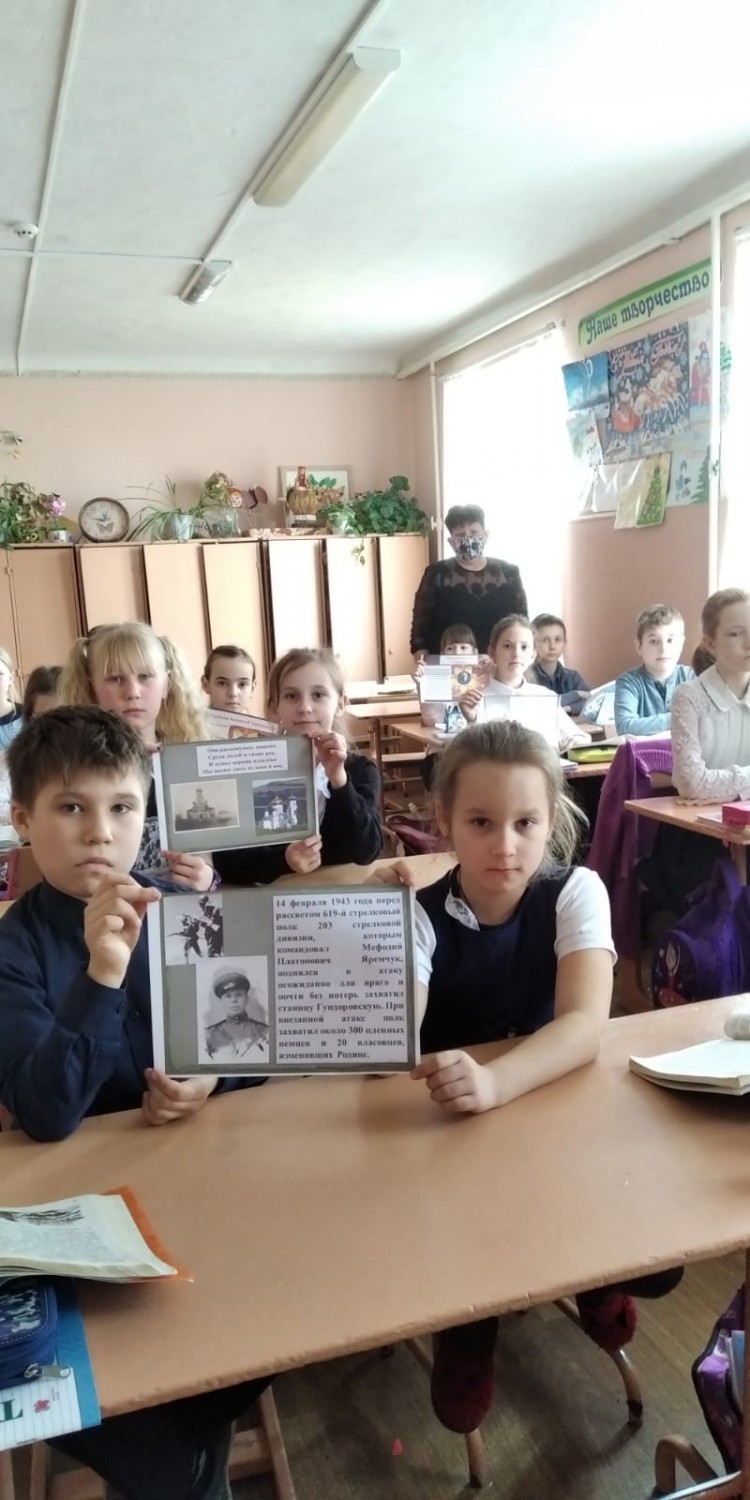 В рамках месячника патриотического воспитания в 3 классе ( Огурцова Т.Б.) прошёл классный час : « Есть даты в снежном феврале». Ребята узнали историю станицы Гудоровская до и во время войны, поговорили о подвигах людей, которым выпала нелёгкая судьба. Жертвами озверевших фашистов стали Гриша Акулов, Лёня Воробьёвский, Я.П. Акулов, Голиков. Освободил с. Гундоровскую 619-й стрелковый полк 203 стрелковой дивизии под командованием Героя Советского Союза генерал – майора Зданович Г.С.