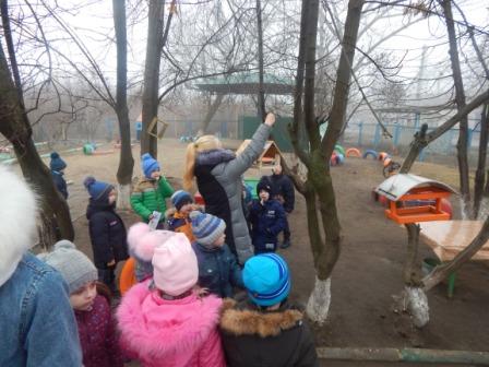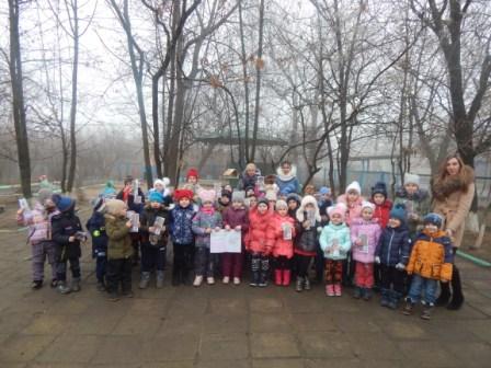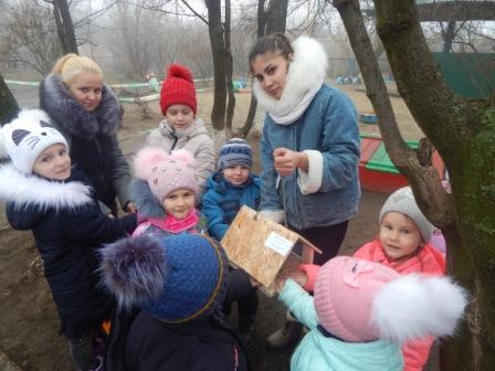 Далее школьники подарили детскому саду 2 кормушки, которые ребята совместно повесили на деревьях и наполнили кормом. Кроме этого малышам и их педагогам были вручены красочные буклеты, разработанные победителями конкурса на лучшую листовку о зимующих птицах, проводимого МБУДО ДДТ г. Донецка в рамках акции-конкурса «Синичкин день».