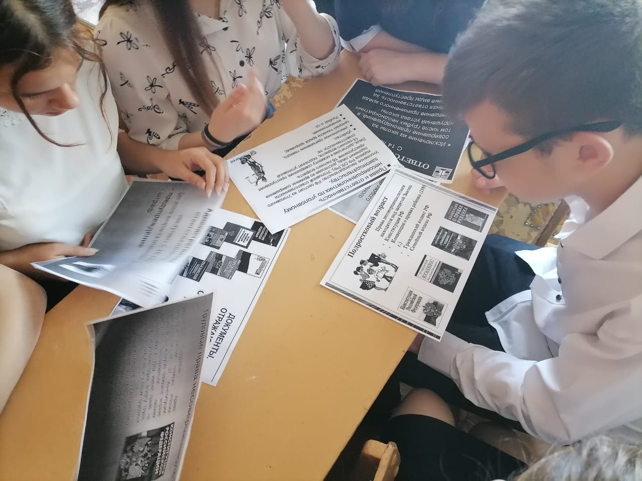 Во время классного часа были рассмотрены права детей, записанные в Конвенции о правах ребёнка и законодательных актах Российской Федерации, во Всеобщей декларации прав человека, обсуждались жизненные ситуации, в которые попадали знакомые ребятам литературные герои, чьи права оказались нарушенными с точки зрения международного права. Во время классного часа учащиеся получили возможность ознакомиться с конкретными материалами: извлечения из Конституции Российской Федерации, Уголовно-процессуального Кодекса РФ, Кодекса об административных нарушениях, Семейного кодекса РФ. Анализ извлечений из этих юридических документов, позволит учащимся не только узнать нормы международного и отечественного права в отношении несовершеннолетних, но и на практике убедиться в исполнении законодательства в настоящее время. Всё это призвано убедить учащихся в неминуемом наказании за проступки или преступления.