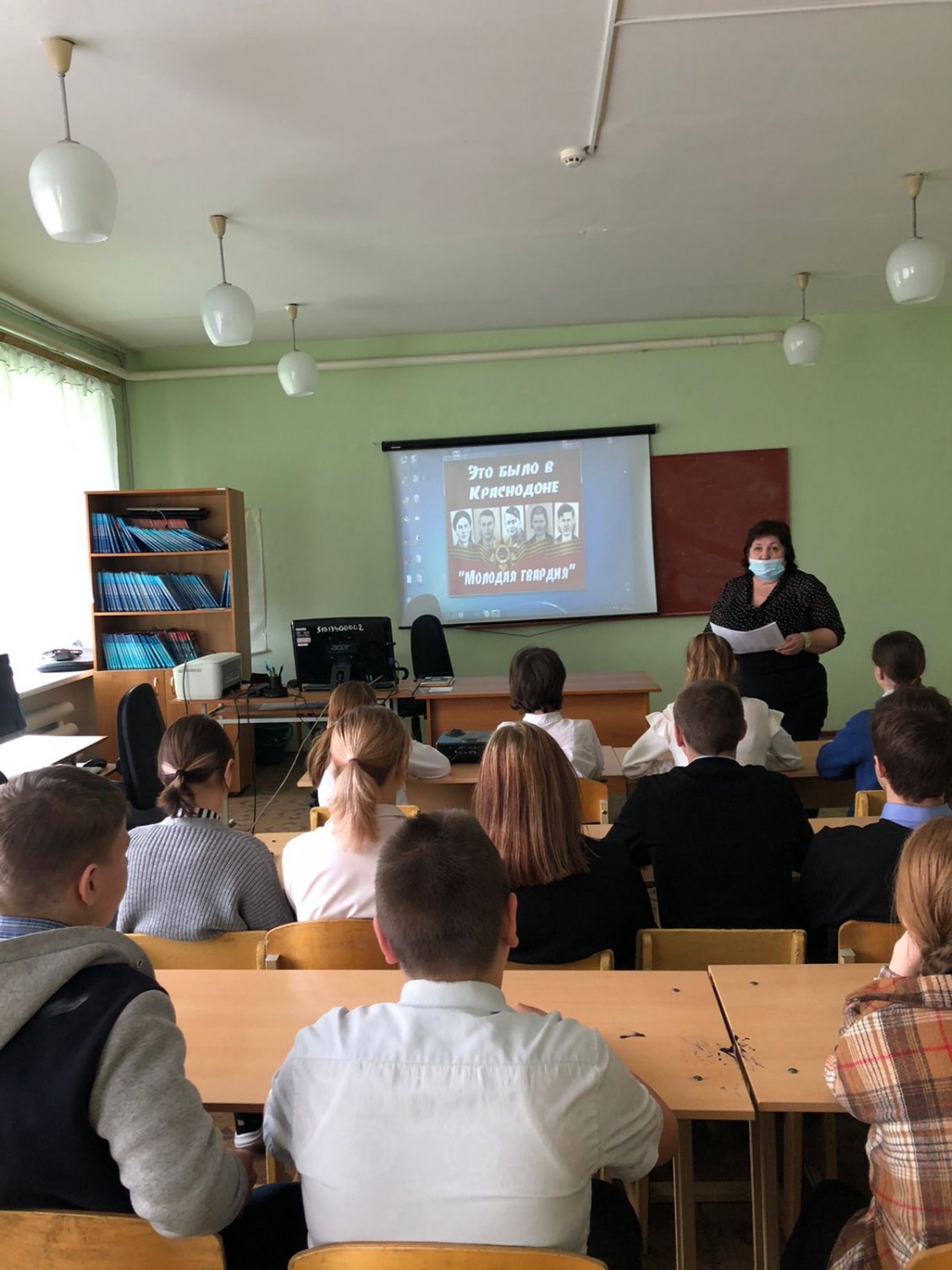 В героической летописи Великой Отечественной войны советского народа против немецко-фашистских захватчиков подвиг юных подпольщиков Краснодона – членов комсомольской организации “Молодая гвардия” сияет немеркнущей страницей. Во время урока обучающиеся вспомнили историю создания подпольной организации, окунулись в героические и трагические события тех тяжелых военных лет.