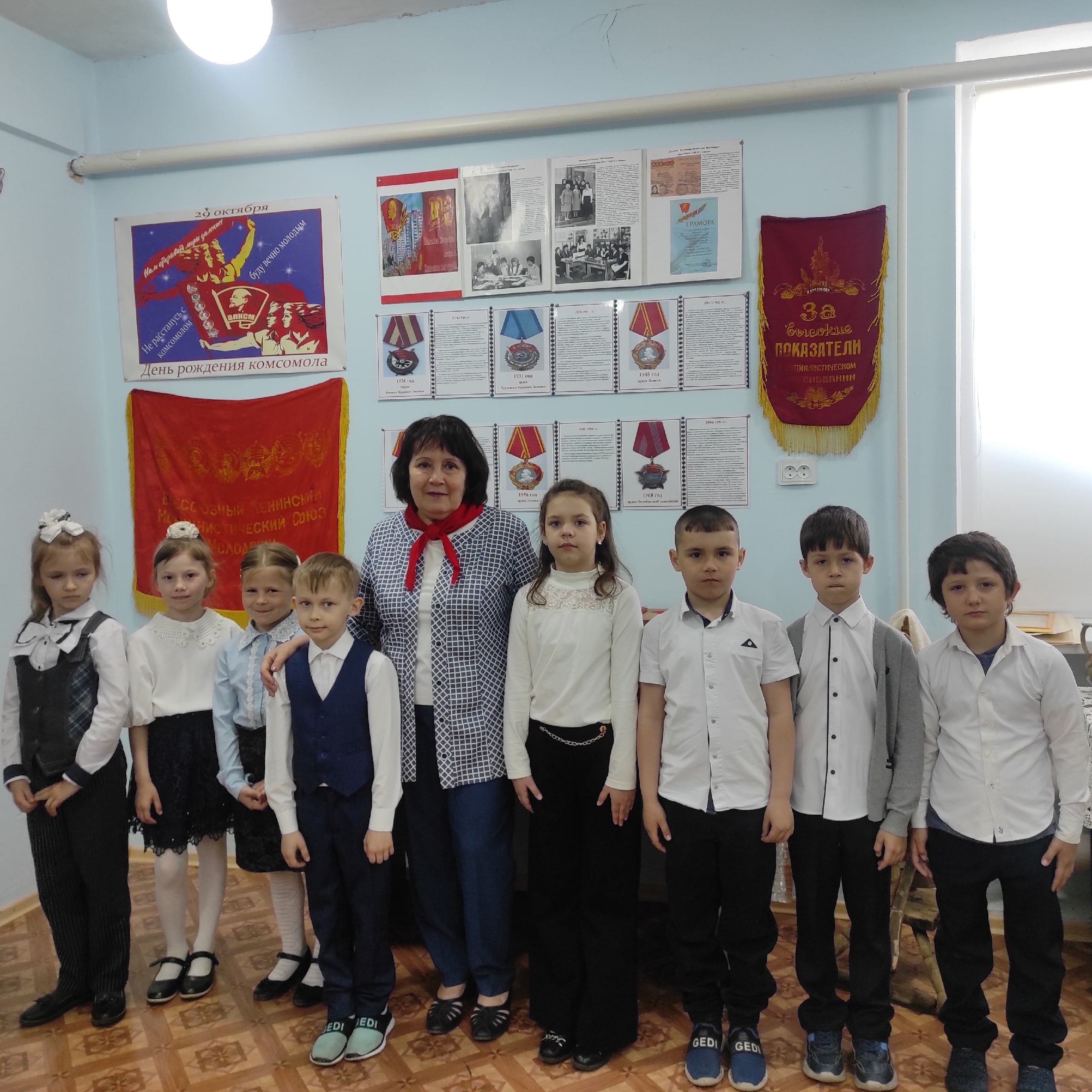 Лариса Федоровна представила экспозицию, открытую к столетию комсомола «Комсомол - не просто возраст, комсомол – моя судьба». Она рассказала ребятам, что была активным членом ВЛКСМ, пришла в школу пионервожатой. Первоклашки с интересом слушали об октябрятах, о пионерии, о красном галстуке, который был символом отваги, мужества, преданности не только пионерской организации, но всей Советской стране. Для каждого школьника стать пионером было великим счастьем. Разве можно забыть впервые повязанный старшим товарищем галстук, сотни глаз, устремлённых на тебя, знамя дружины, пионерскую клятву: «Я, вступая в ряды Всесоюзной пионерской организации имени Владимира Ильича Ленина, перед лицом своих товарищей торжественно обещаю…». И счастье, гордость охватывало за то, что теперь ты не просто ребёнок, а пионер. Все знали, что пионер – всем ребятам пример. Поэтому старались, как могли: хорошо учились, были активными, ответственными, дружно работали, организовывали тимуровские отряды, собирали металлолом, макулатуру, соревновались, кто больше сдаст. А самые активные ребята награждались путевками в лучшие лагеря страны.